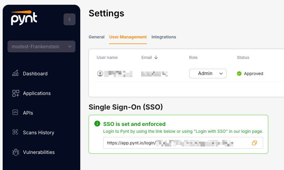 Once set, your users could sign up and login to Pynt via your dedicated Login URL or the SSO login option in the login page.
