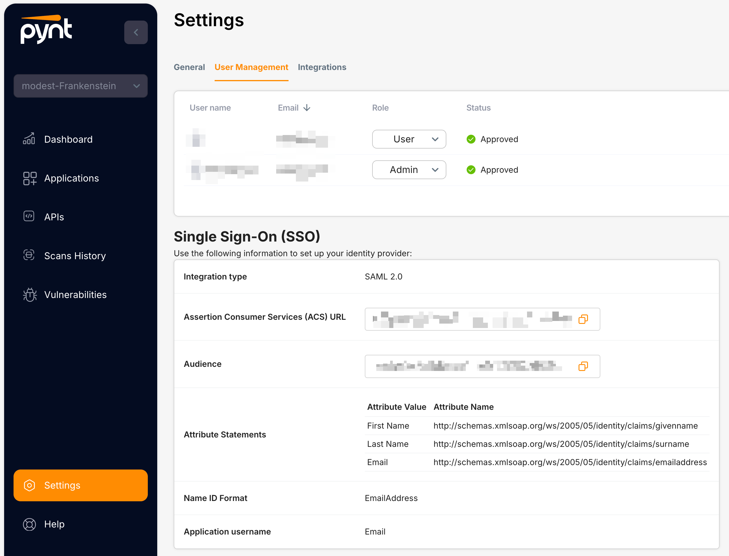1. Set up your identity provider with values from Pynt's [User Management](https://app.pynt.io/dashboard/settings/users-management) page.