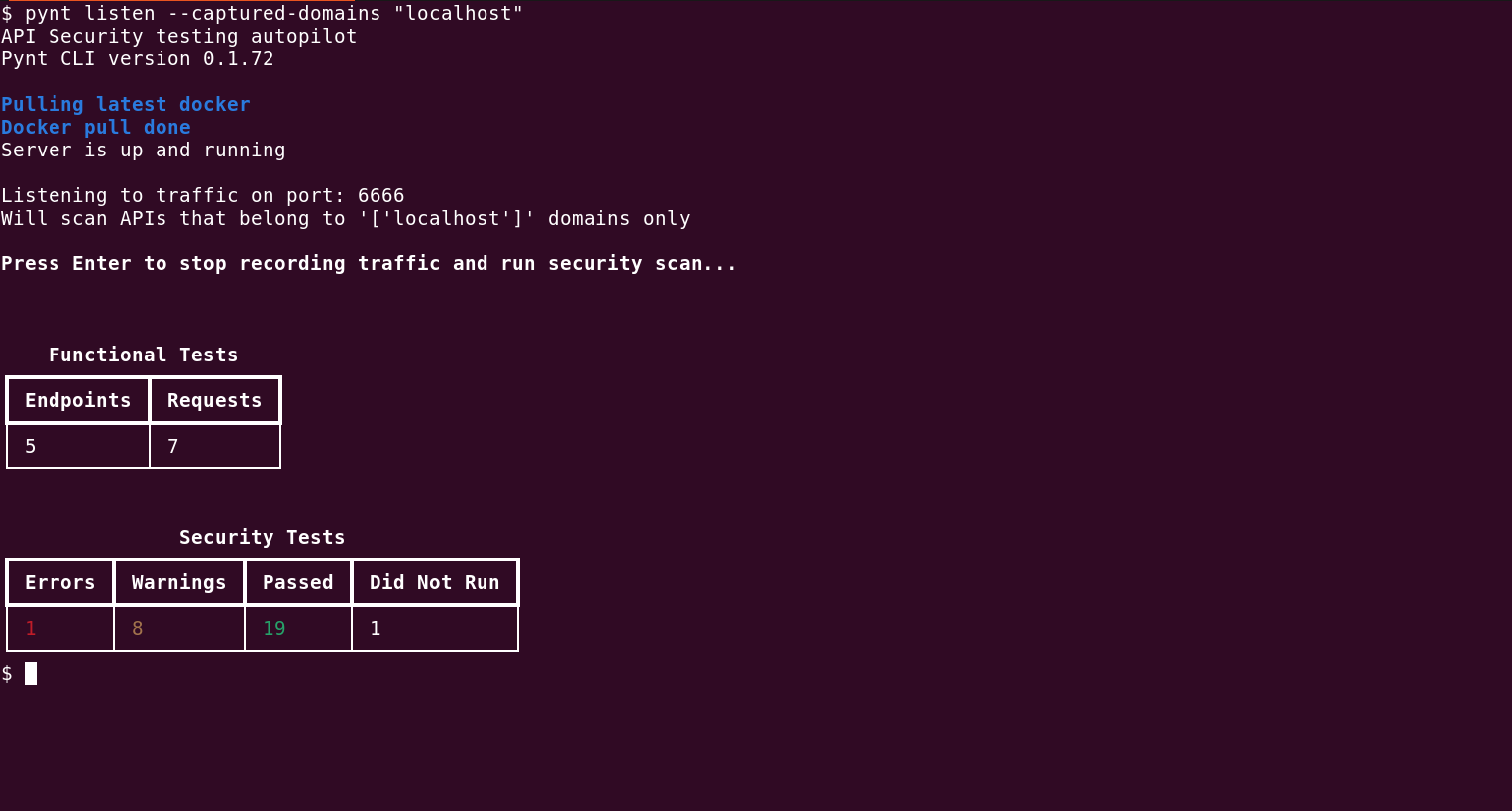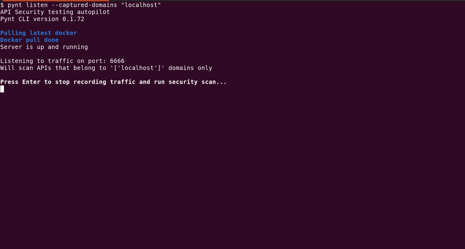 For this example we will use [`Pynt listen`](https://docs.pynt.io/documentation/api-security-testing/pynt-cli-modes/pynt-listen-cli-mode) and set it to capture localhost traffic: